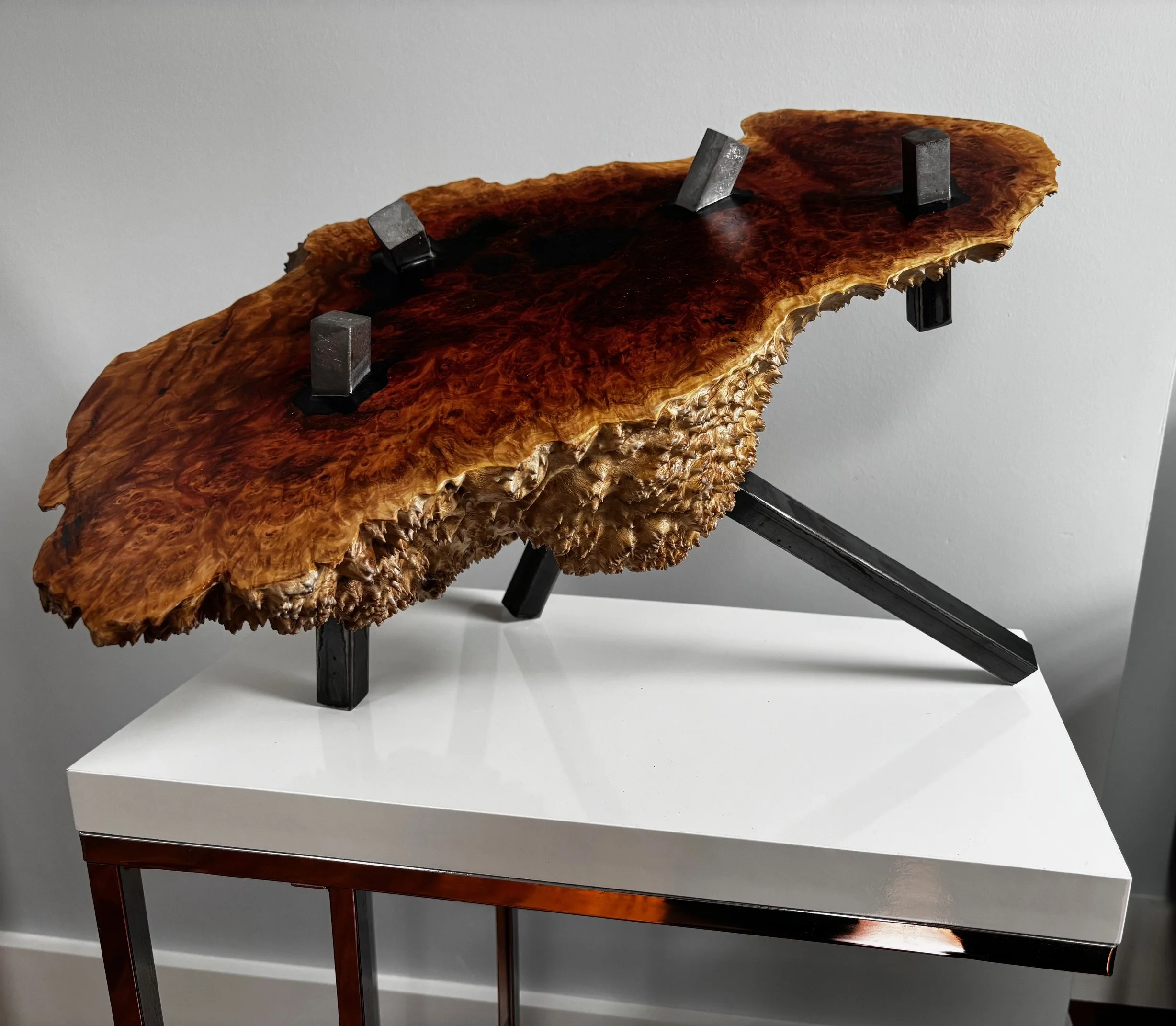 Each piece begins with an irreproducible natural form resolved through highly selective intervention, technical precision, and a developed intellectual framework. The result is not decorative woodwork, but collectible conversational form: scarce, labor-intensive, spatially commanding, and difficult to replicate either materially or conceptually. That distinctiveness continues in the way each work engages its surroundings. As illumination changes, the work often produces a secondary visual experience of shifting silhouettes, mirrored fragments, and spatial echoes that evolves with placement, time of day, and the viewer’s position.